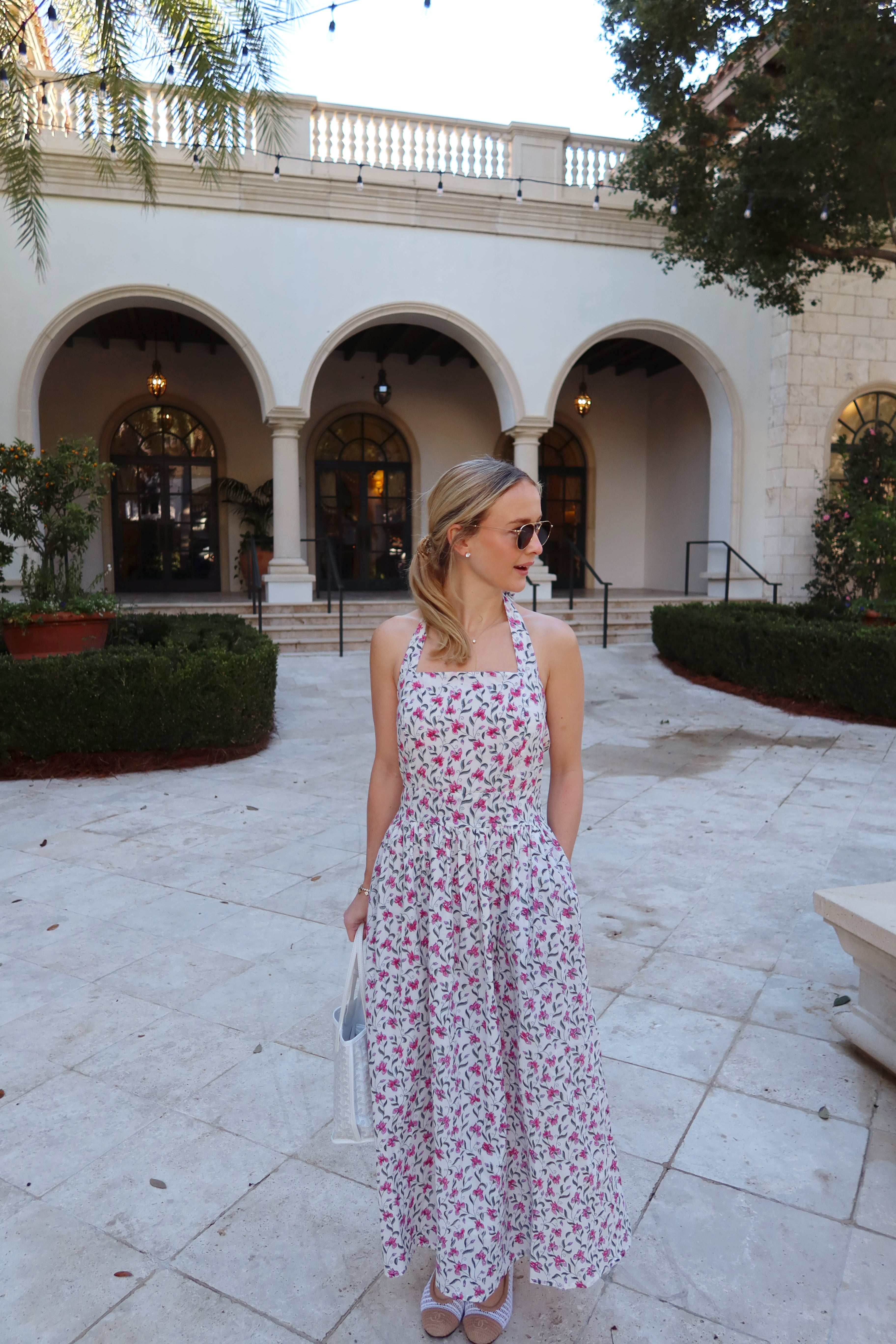 Meet The Newport Dress! The perfect halter dress in a delicate pink and green blossom print. It features functional ties and creates a flattering, subtle square neckline. The back has smocking, adding stretch and comfort while maintaining shape.